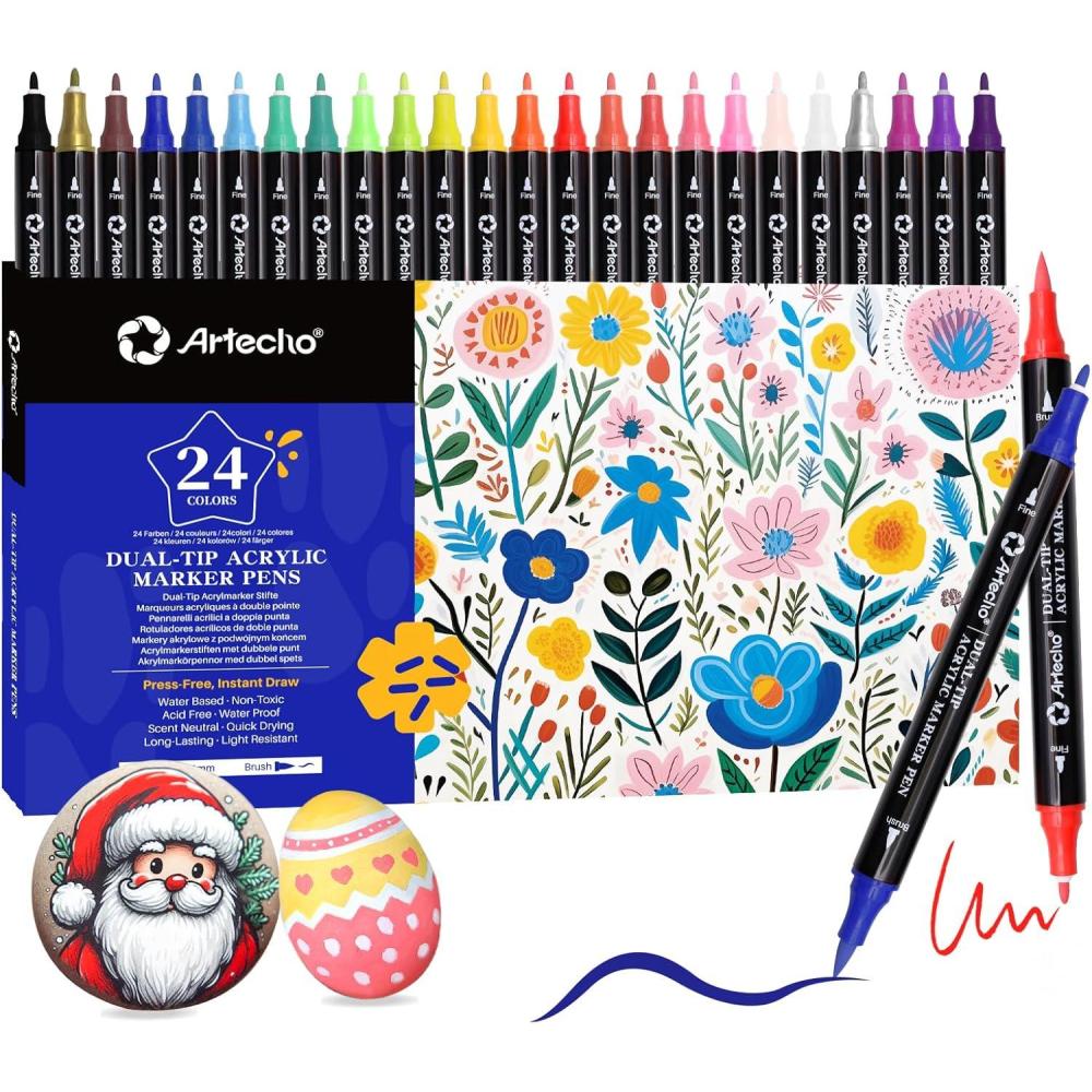 imageArtecho Acrylic Paint Markers 60 Colors Acrylic Paint Pens with Brush Tip and Fine Tip for Stone Rock Painting Paper Pumpkin Wood Egg Canvas Ceramic Fabric leather Glass DIY Crafts24 Colors