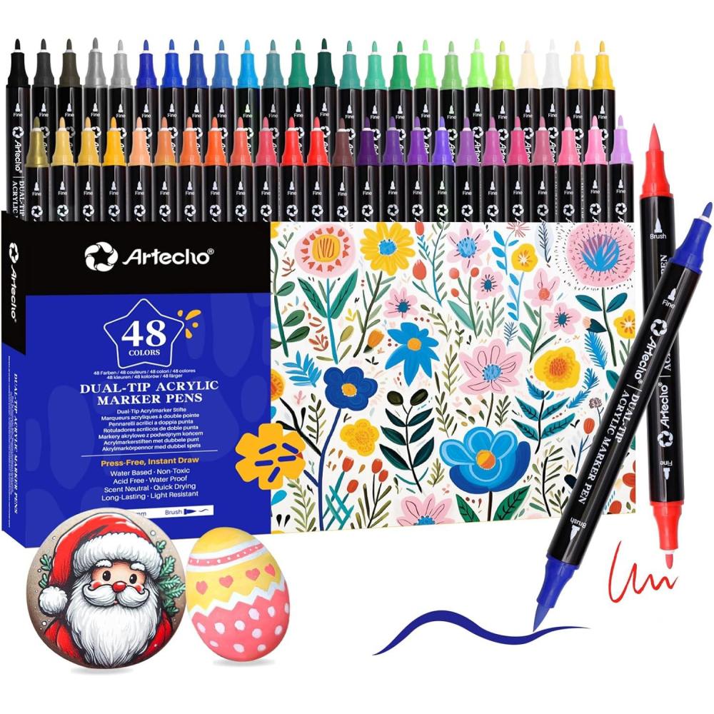 Artecho Acrylic Paint Markers 60 Colors, Acrylic Paint Pens with Brush Tip and Fine Tip for Stone, Rock Painting, Paper, Pumpkin, Wood, Egg, Canvas, Ceramic, Fabric, leather, Glass, DIY Crafts(48 Colors)
