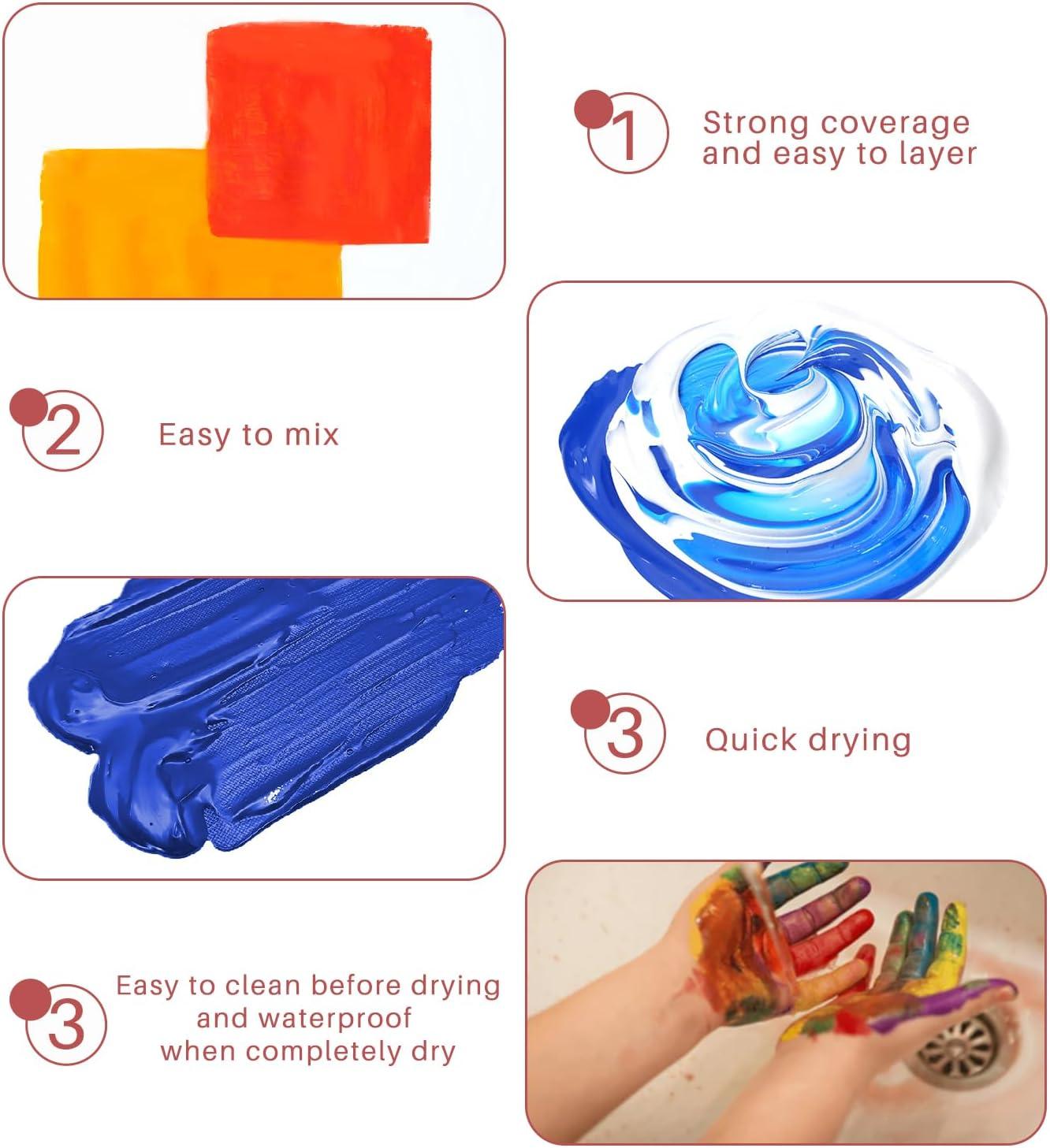 Quick Drying & Easy to Clean before Drying: It takes about 3-12 hours to dry completely. Once dried, acrylic paints become water-resistant and durable. Water-bases, Non-Toxic and Acide Free paint can be easily cleaned with soap and water before completely dry.