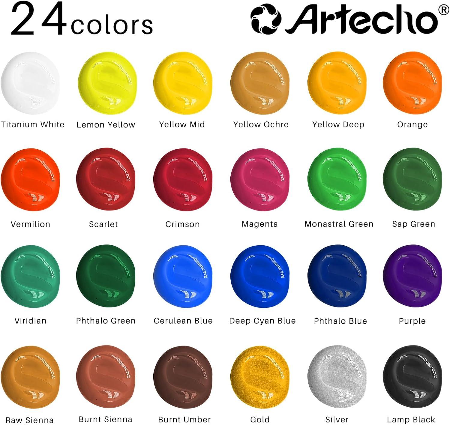 Premium Art Supplies: 24 colors acrylic paint in 60ml/2oz bottles, providing the most commonly used colors: Titanium White, Lemon Yellow, Yellow Mid, Yellow Ochre, Yellow Deep, Orange, Vermilion, Scarlet, Crimson, Magenta, Monastral Green, Sap Green, Viridian, Phthalo Green, Cerulean Blue, Deep Cyan Blue, Phthalo Blue, Purple, Raw Sienna, Burnt Sienna, Burnt Umber, Gold, Silver, Lamp Black.