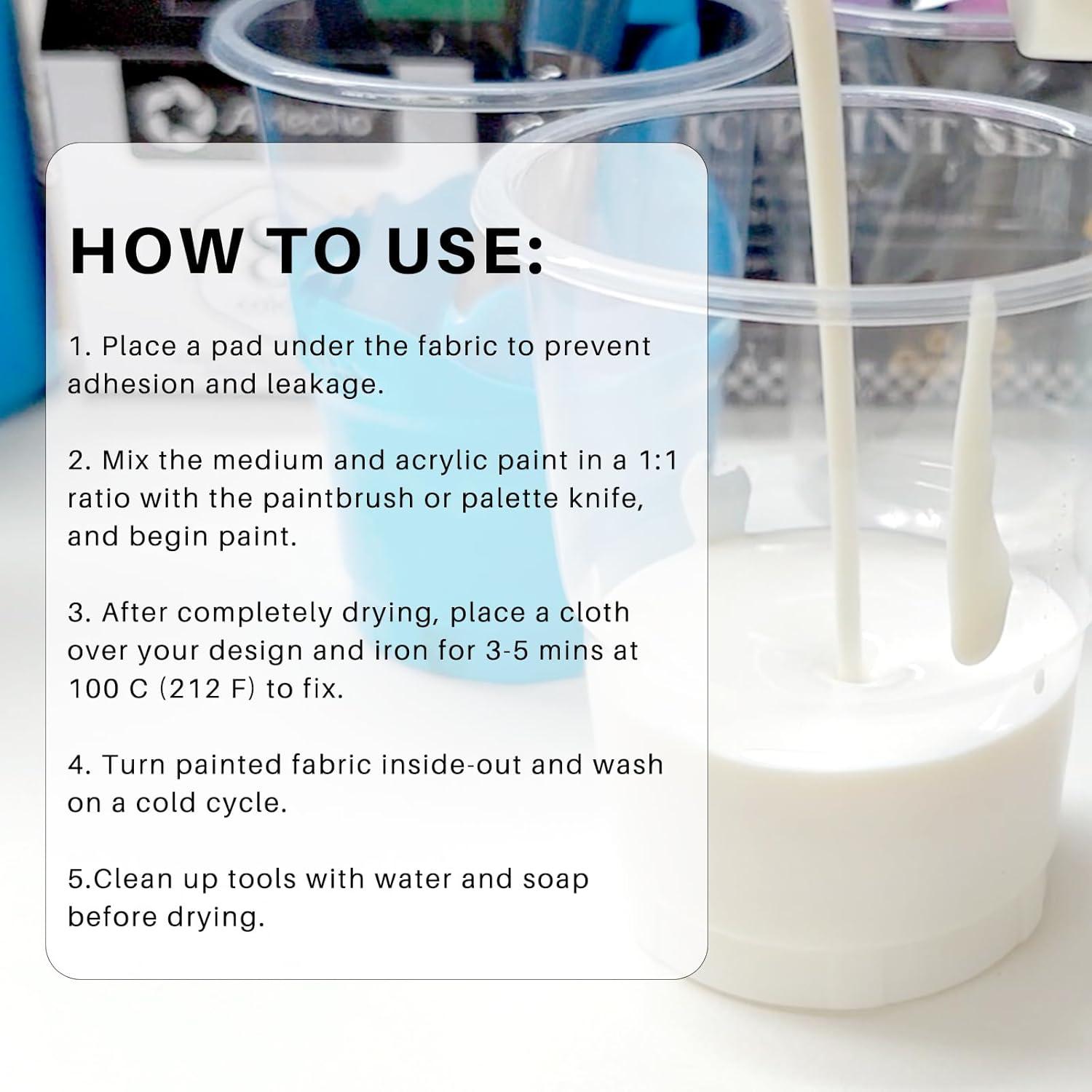 How to Use: 1. Place a pad under the fabric to prevent adhesion and leakage; 2. Mix the medium and acrylic paint in a 1:1 ratio with the paintbrush or palette knife, and begin paint; 3. After completely drying, place a cloth over your design and iron for 3-5 mins at 100 C(212 F) to fix; 4. Turn painted fabric inside-out and wash on a cold cycle; 5.Clean up tools with water and soap before drying
